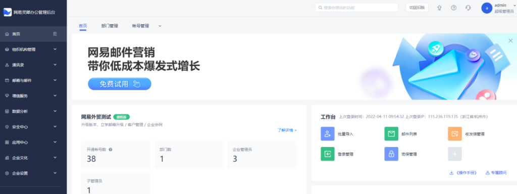 在绑定账号前,请先确认您可登录网易企业邮箱的管理后台(建议使用admin帐号,避免因为权限原因耽误您的时间)。