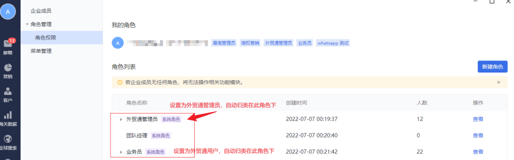 8.登录外贸通管理员后点头像进入 菜单栏-权限设置 ,已预置外贸通管理员、团队经理、业务员三类系统角色。