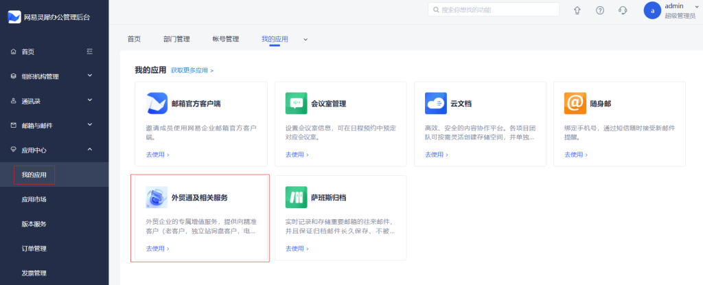 2.依次选择应用中心 – 我的应用 – 外贸通及相关服务 – 去使用>按钮