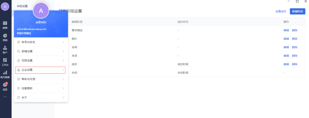 使用配置的外贸通管理员,登录客户端点击企业设置,即可进行销售阶段设置。