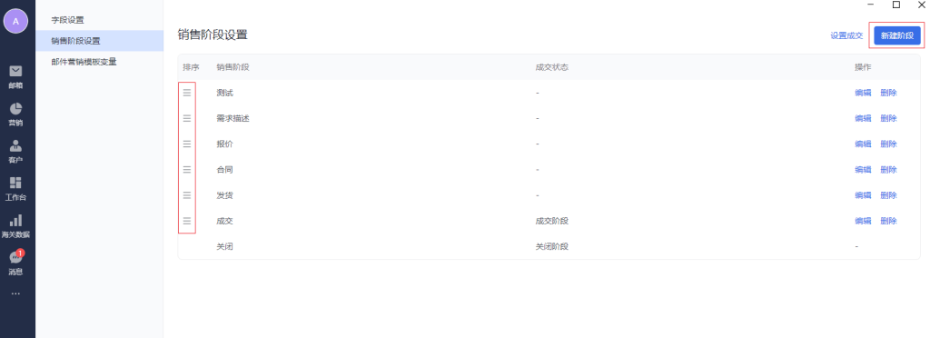 创建成功后,可进行“编辑/删除”操作,也可点击左侧的排序,调整销售阶段位置顺序。