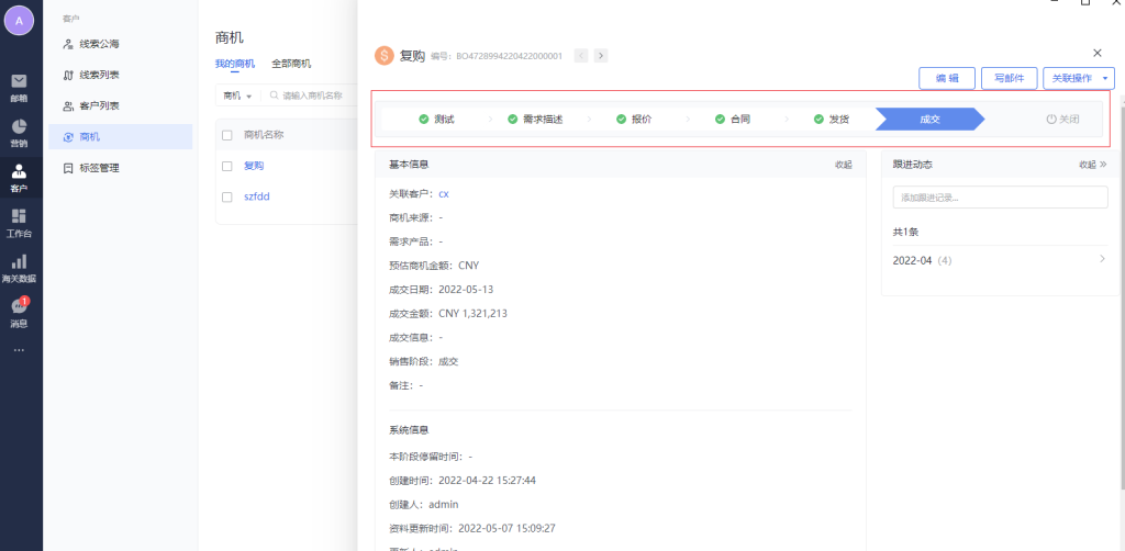 支持自定义新建&配置“销售阶段“,设置成交阶段。(单个企业级别)