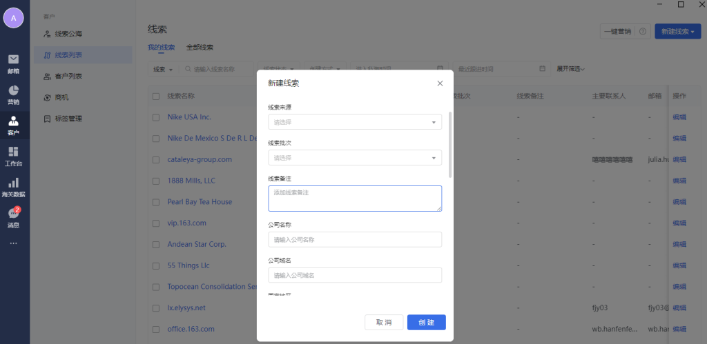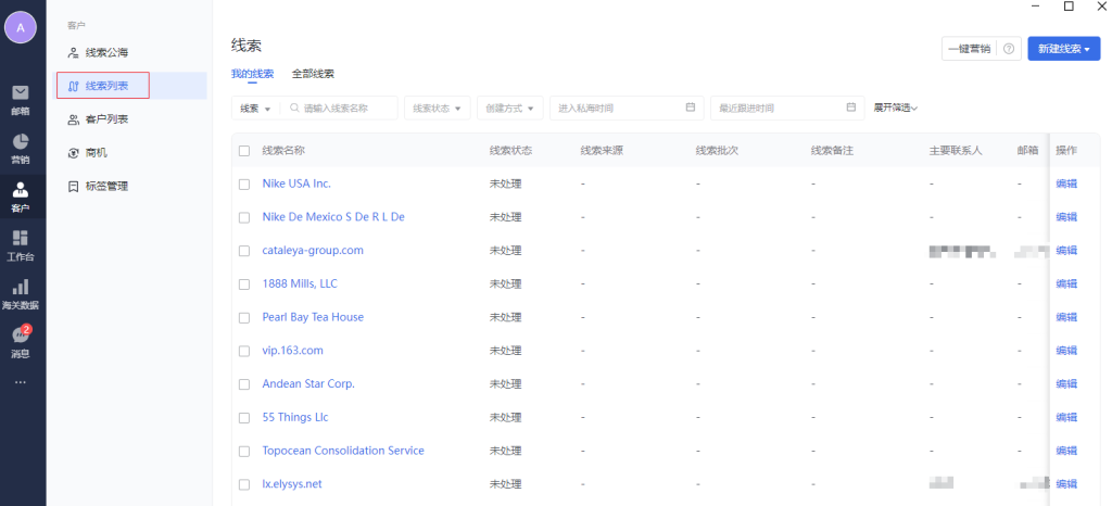 线索列表支持手动新建、海关数据导入、往来邮件推荐、个人通讯录导入、发送营销邮件时勾选自动同步营销邮件收件人到线索管理,并进行后续的更多管理操作。