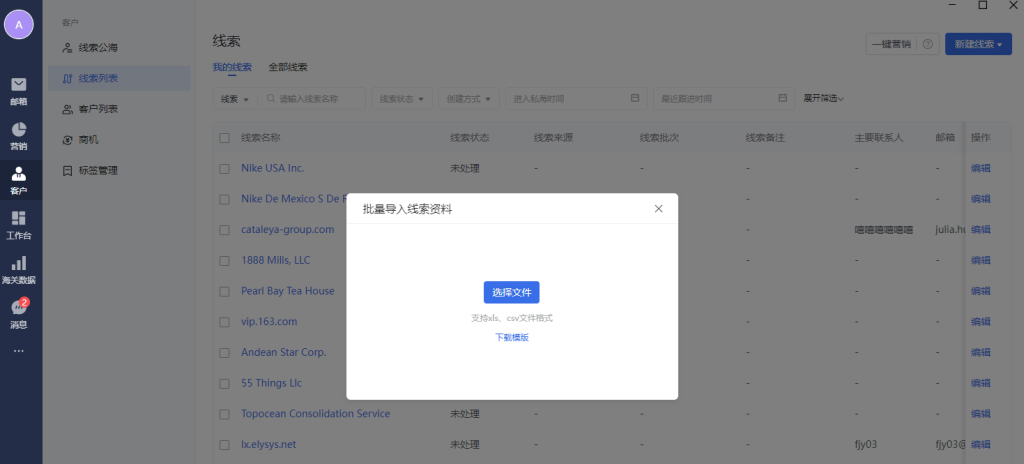 批量导入:可以通过模版,批量导入线索数据。
