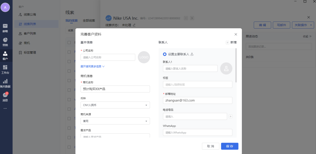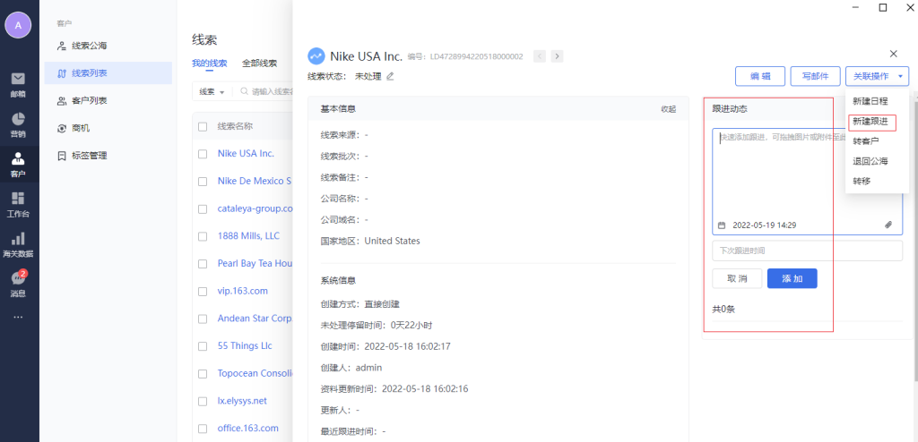 点击右上角“新建跟进”,可以新建跟进记录,并且关联到当前线索下。
