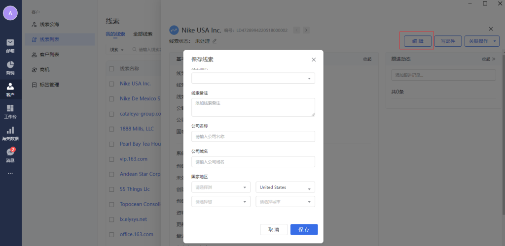点击右上角的“编辑”按钮,弹出线索弹窗,可以编辑线索信息。