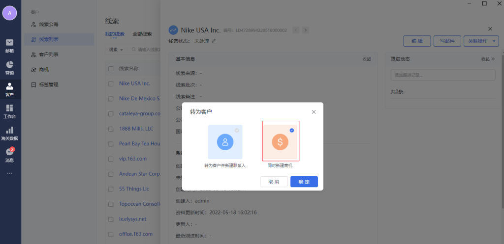 默认选中“转为客户并新建联系人”,在弹窗中填写客户、联系人信息后,可以完成新建。