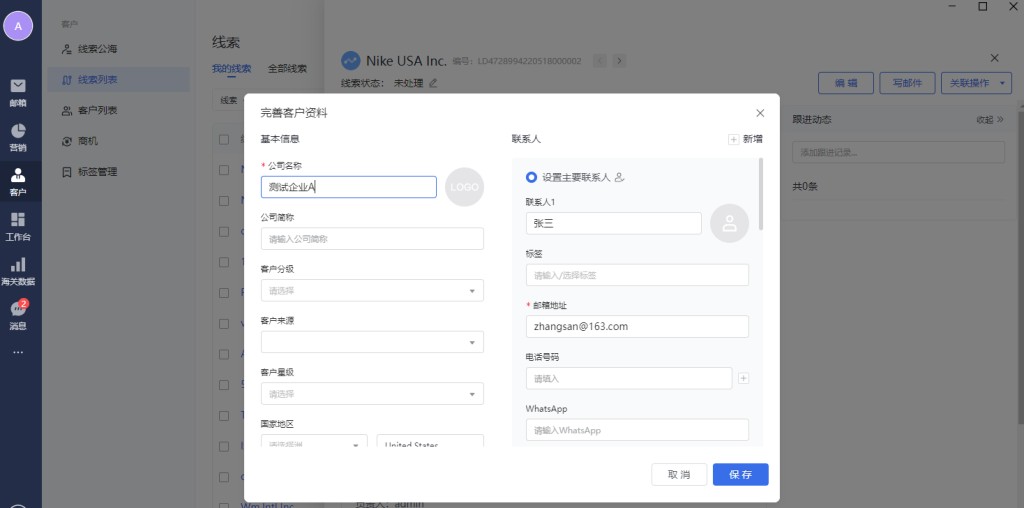 点击右上角“新建线索”,弹出新建线索弹窗,填写字段后,保存即可。