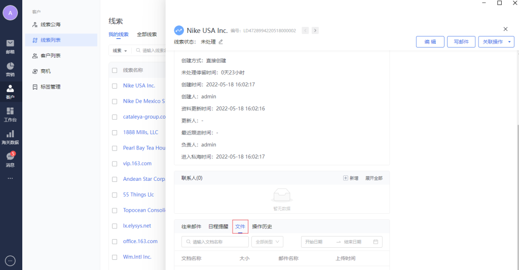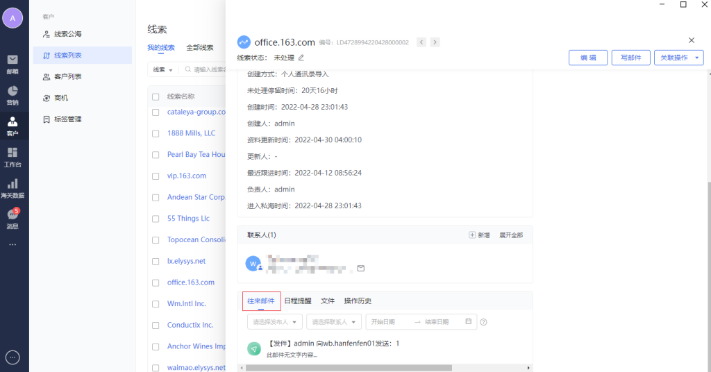 往来邮件的tab栏区域,显示线索联系人邮箱相关的往来邮件的记录。