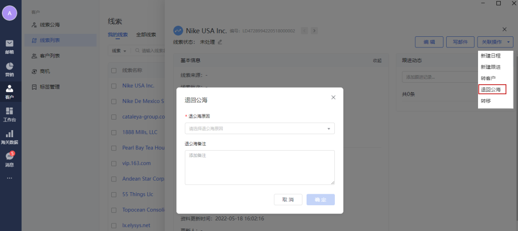 退回公海:将自己名下线索退回公海池。可由其他同事领取跟进。