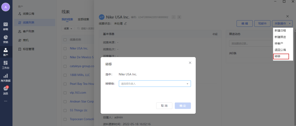 转移:转移线索给其他负责人,会出现在其他负责人的“我的线索”里面,其他负责人进行处理。