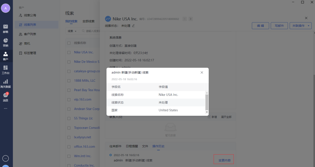 -操作历史的类型:新建(往来邮件推荐)、新建(个人通讯录导入)、新建(EDM收件人)、新建(手动新建) 、新建(批量导入)、编辑(手动编辑)、线索状态变更