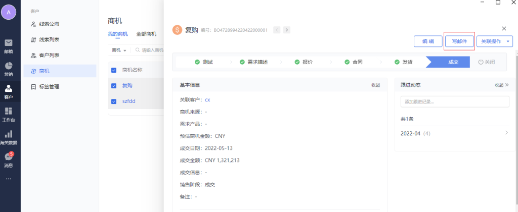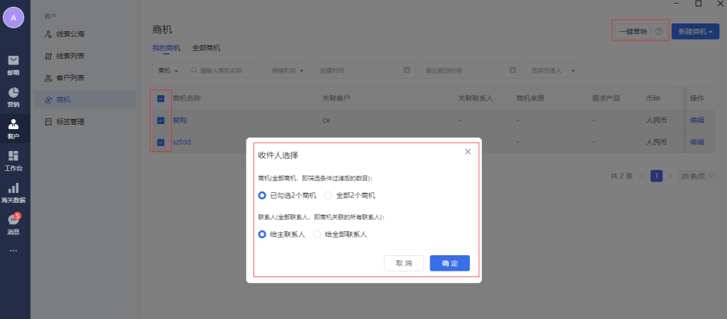 批量选择商机,支持给商机关联的联系人发送营销邮件。确定后会跳转到新建发件任务页面。