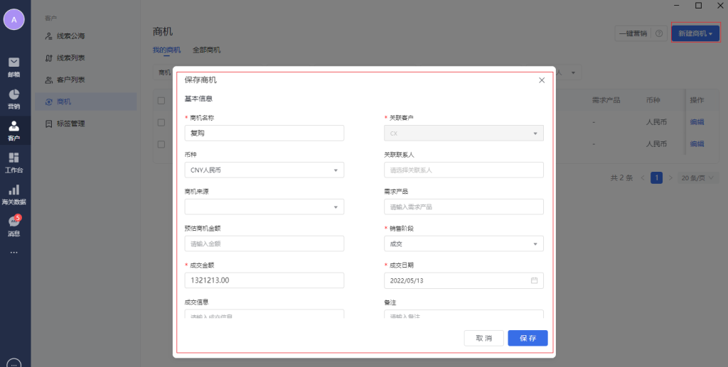 创建的商机可以关联客户、联系人等信息,配置预计商机规模、销售阶段等信息,掌握意向客户动态。