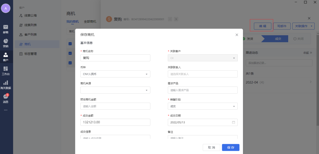 点击右上角的“编辑”按钮,弹出商机弹窗,可以编辑商机信息。