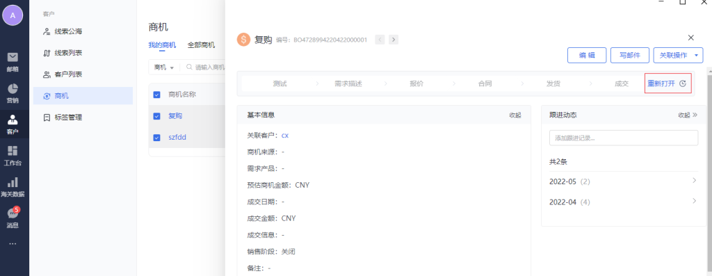 可以推进商机的销售阶段,直至成交。点击销售阶段,即可进行变更。
