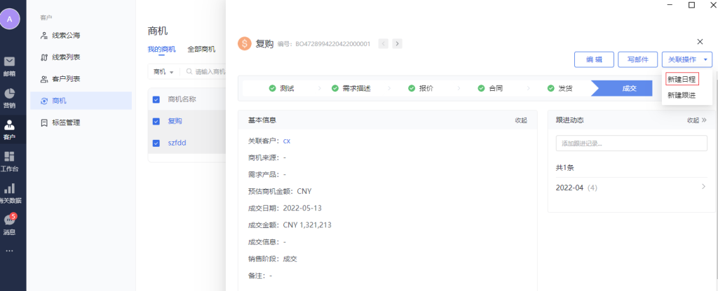 点击“新建日程”,可以新建日程,并且关联到当前的商机数据下。