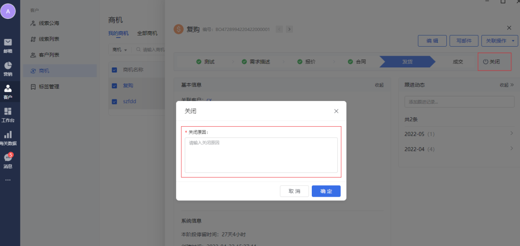 如果商机无效,可以关闭当前商机,关闭时,需要填写“关闭原因”。