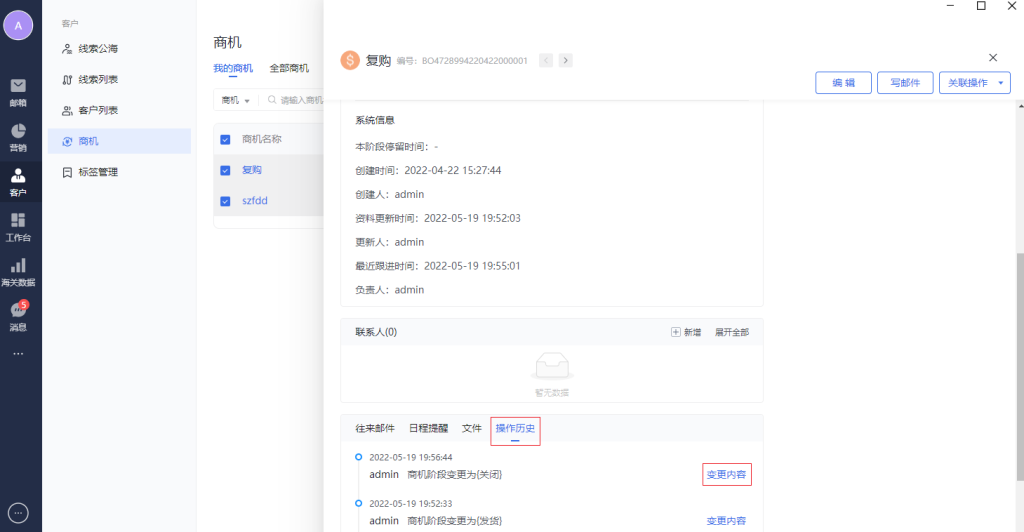 -操作历史的类型:新建(手动新建)、新建(批量导入)、编辑(手动编辑)、商机阶段变更为{成交}