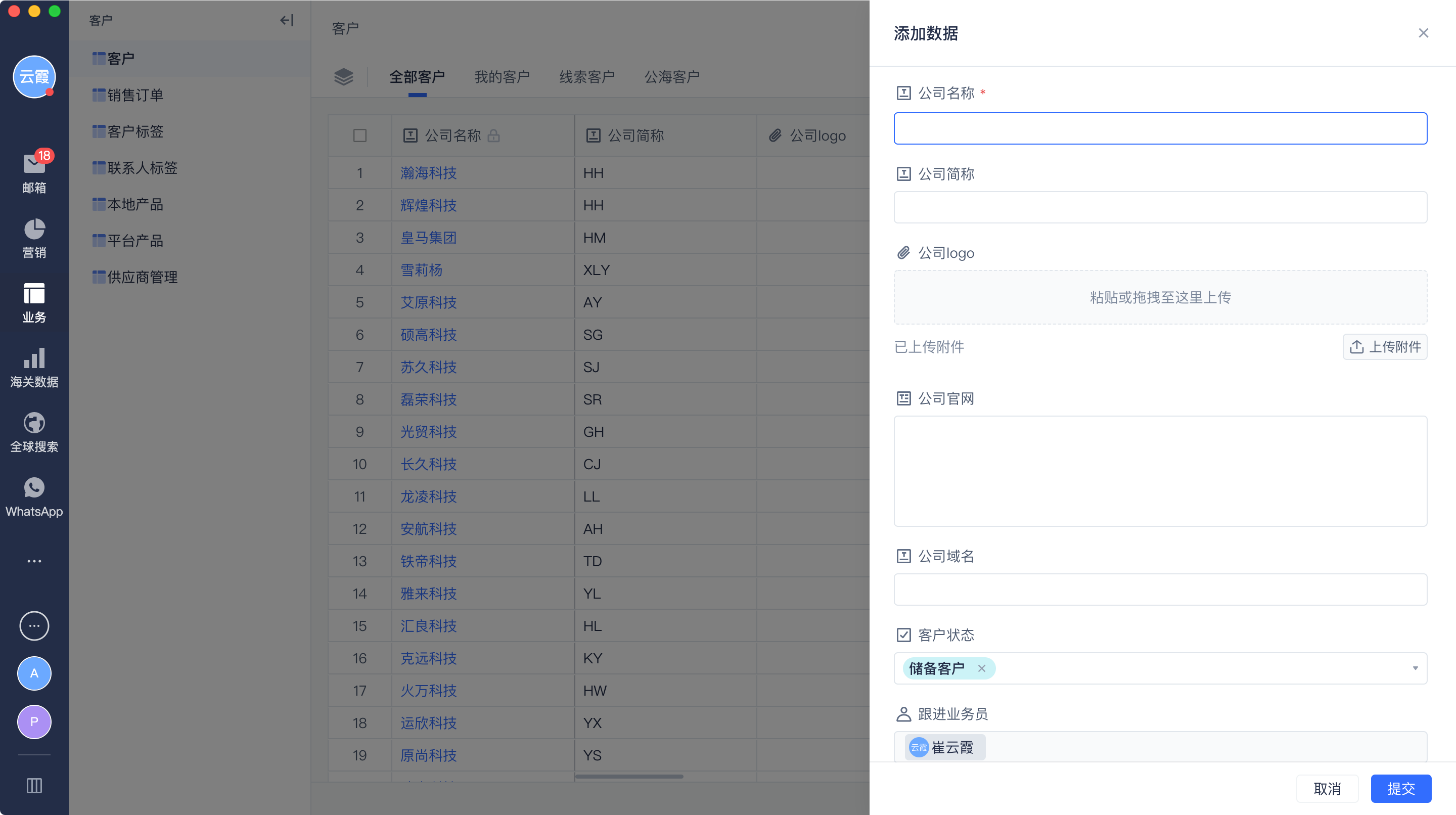 业务员可认领公海客户数据为自己的客户进行跟进,团队主管也可为下属分配客户。