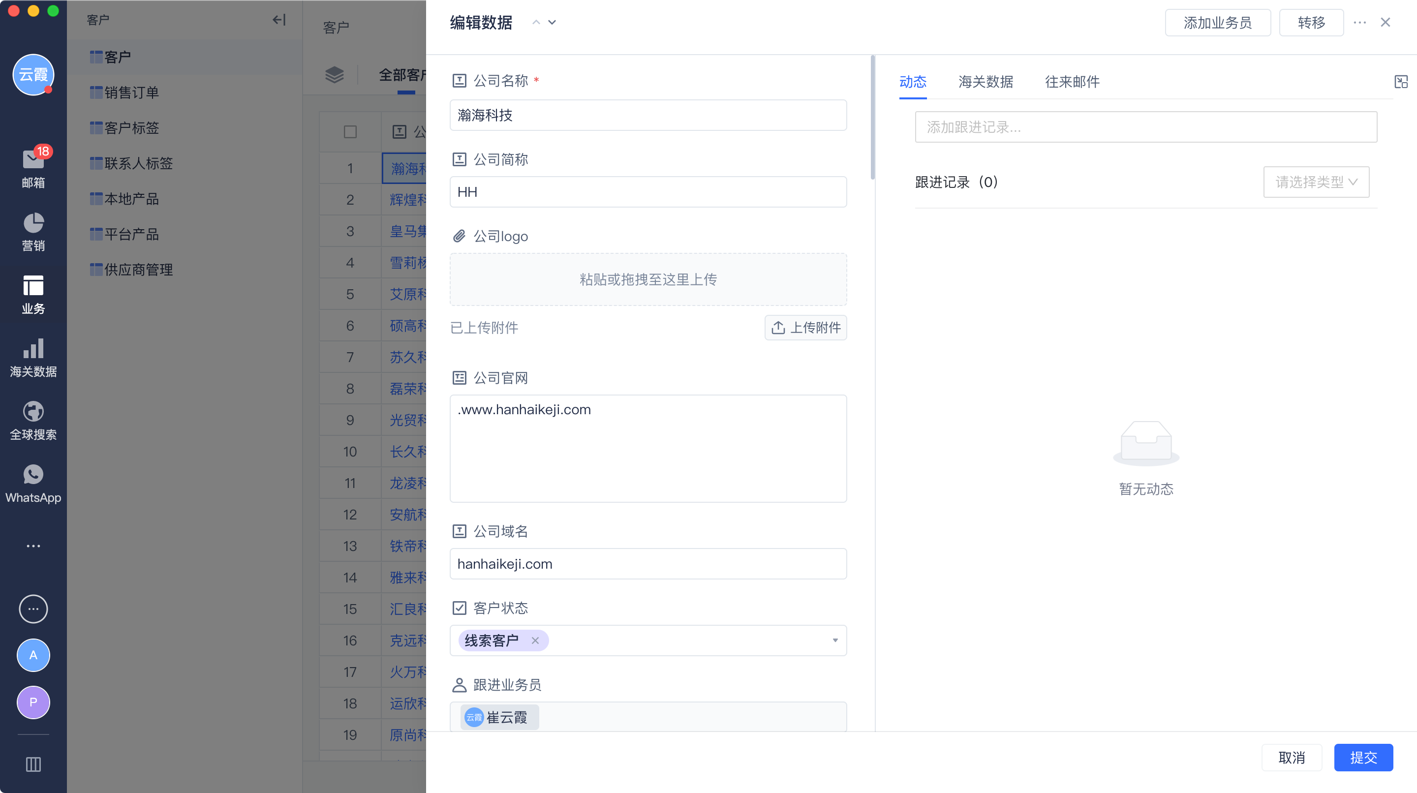 在客户表中点击公司名称或首列的查看或者编辑图标可进入详情页,如果您有编辑权限则直接可在详情页进行修改相关信息。