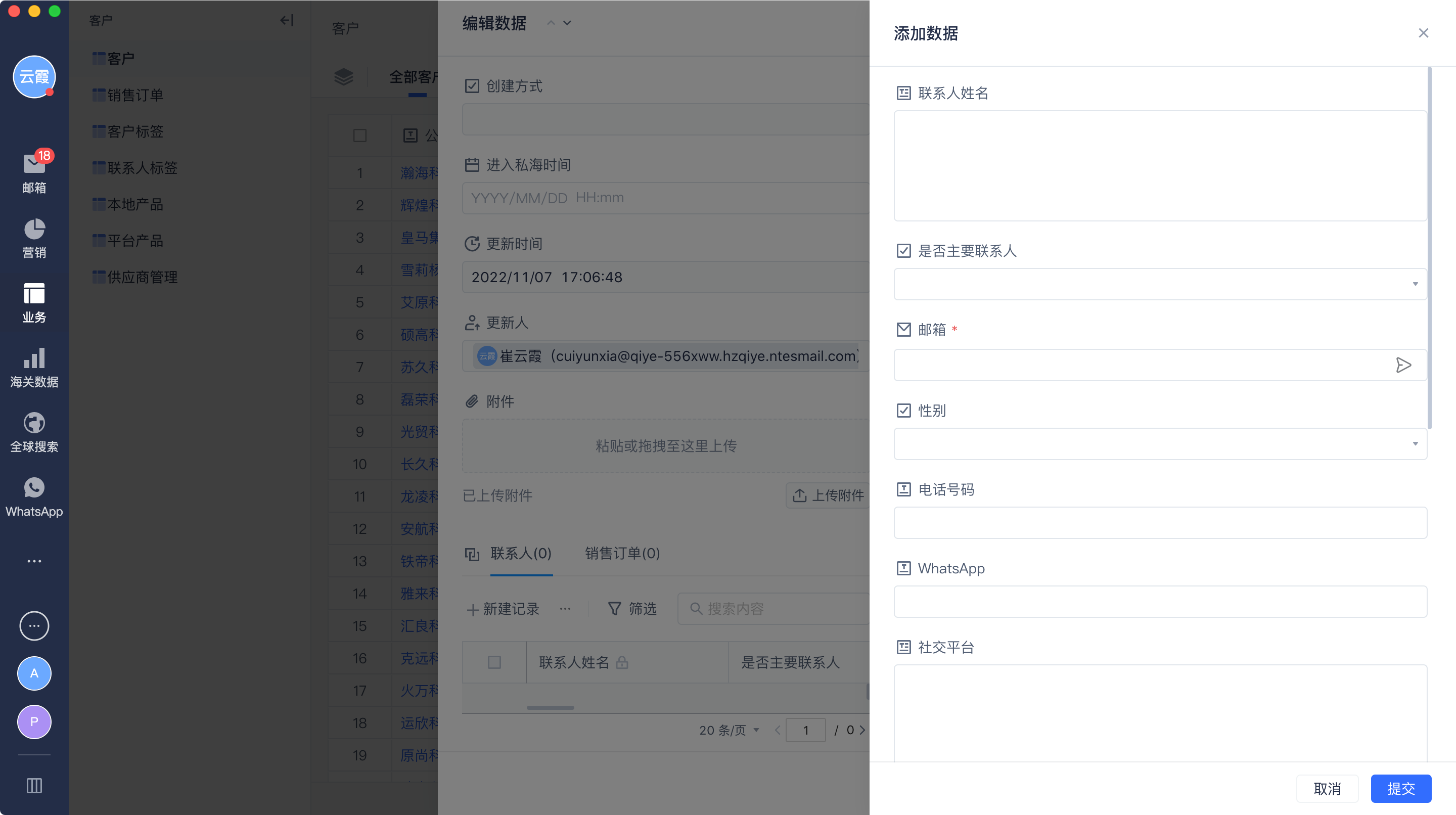 可在详情页为当前客户新增多个联系人,并且可设置一个或多个联系人为主联系人。